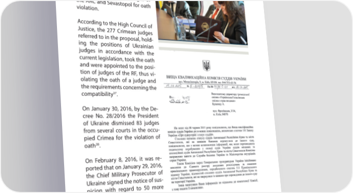 A YEAR AFTER: MAIN VIOLATIONS OF HUMAN RIGHTS IN CRIMEA PART 4 On December 24, 2015, the Su- preme Council of Justice at its meeting considered the rec- ommendation of the HJQB of Ukraine of 10.11.2015 No. 3009/ dp-15 on submission of propos- al for the dismissal of judges of the ARC and Sevastopol for oath violation. According to the High Council of Justice, the 277 Crimean judges referred to in the proposal, hold- ing the positions of Ukrainian judges in accordance with the current legislation, took the oath and were appointed to the posi- tion of judges of the RF, thus vi- olating the oath of a judge and the requirements concerning the compatibility37. On January 30, 2016, by the De- cree No. 28/2016 the President of Ukraine dismissed 83 judges from several courts in the occu- pied Crimea for the violation of 38 oath . On February 8, 2016, it was re- ported that on January 29, 2016, the Chief Military Prosecutor of Ukraine signed the notice of sus- picion with regard to 50 more judges of the ARC and Sevas- topol, which betrayed the peo- ple of Ukraine. The published list included the Crimean judges which had not been appointed as judges by the RF President’s 37 http://www.vru.gov.ua/news/1256 38 http://www.president.gov.ua/documents/282016-19751 129