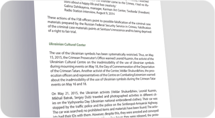 A YEAR AFTER: MAIN VIOLATIONS OF HUMAN RIGHTS IN CRIMEA PART 4 fy against Sentsov. Other members of the art center who personally knew Sentsov have also got under pressure under pressure. Due to intimidation from FSB o7 cers, Galina Dzhikayeva had to leave the Crimea. ‘I had been + ghting Yanukovich’s government in every way I could, both as a journalist and an artist. I saw what was happening in Russia, I watched the monster grow. When the monster came to the Crimea, I had no illu- sions about a happy life and free creativity.’ Galina Dzhikayeva, manager, Karman Art Center, ‘Svoboda’ (Freedom) Radio Station interview, August 9, 2014 These actions of the FSB o7 cers point to possible falsiR cation of the criminal case materials prepared by the Russian Federal Security Service in Crimea. FalsiR cation of the criminal case materials points at Sentsov’s innocence and his being deprived of a right to fair trial. Ukrainian Cultural Center The use of the Ukrainian symbols has been systematically restricted. Thus, on May 15, 2015, the Crimean Prosecutor’s O7 ce warned Leonid Kuzmin, the activist of the Ukrainian Cultural Centre on the inadmissibility of the use of Ukrainian symbols during mourning events on May 18, the Day of Commemoration of the Deportation of the Crimean Tatars. Another activist of the Center, Veldar Shukurdzhiev, the pros- ecution o7 cers and representatives of the Centre on Combating Extremism warned about the inadmissibility of the use of Ukrainian symbols during the Crimean Tatar events on May 16 and 18. On May 21, 2015, the Ukrainian activists (Veldar Shukurdzhiev, Leonid Kuzmin, Mikhail Batrak, Sergey Dub) traveled and photographed activities in diT erent cit- ies on the Vyshyvanka Day (Ukrainian national embroidered clothes). Their car was stopped by the tra7 c police and the police on the Simferopol-Armyansk highway. The car was searched; no prohibited items and materials have been found. The activ- ists had their IDs with them. However, despite this, they were arrested and convoyed to the police station in Armyansk. After a few hours they were released, the proto- col of arrest stated identity veriR cation as the reason for bringing them to the police station; however, the activists showed their IDs when the car was being searched. On August 11, 2015, in the evening, the activists Veldar Shukurdzhiev and Irina Kopy- lova, took pictures with a Ukrainian U ag at one of the squares in Simferopol, near the monument to Lenin. They were arrested by the police. The protocol was drawn up on violation of the order of holding the meetings, rallies, demonstrations, marches and pickets. However, the taking of pictures by two people in its essence is not a rally, 97