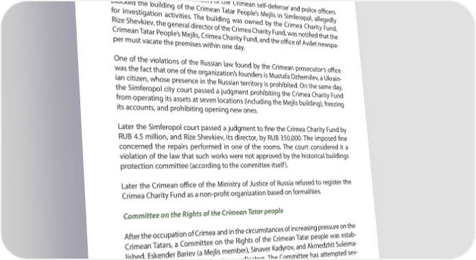 PART 4 A YEAR AFTER: MAIN VIOLATIONS OF HUMAN RIGHTS IN CRIMEA Crimea Charity Fund Crimea Charity Fund was working in the Crimea for many years, supporting the work of the Crimean Tatar People’s Mejlis in many aspects. Mustafa Dzhemilev was one of its founders. On September 16, 2014, members of the ‘Crimean self-defense’ and police o7 cers blocked the building of the Crimean Tatar People’s Mejlis in Simferopol, allegedly for investigation activities. The building was owned by the Crimea Charity Fund. Rize Shevkiev, the general director of the Crimea Charity Fund, was notiR ed that the Crimean Tatar People’s Mejlis, Crimea Charity Fund, and the o7 ce of Avdet newspa- per must vacate the premises within one day. One of the violations of the Russian law found by the Crimean prosecutor’s o7 ce was the fact that one of the organization’s founders is Mustafa Dzhemilev, a Ukrain- ian citizen, whose presence in the Russian territory is prohibited. On the same day, the Simferopol city court passed a judgment prohibiting the Crimea Charity Fund from operating its assets at seven locations (including the Mejlis building), freezing its accounts, and prohibiting opening new ones. Later the Simferopol court passed a judgment to R ne the Crimea Charity Fund by RUB 4.5 million, and Rize Shevkiev, its director, by RUB 350,000. The imposed R ne concerned the repairs performed in one of the rooms. The court considered it a violation of the law that such works were not approved by the historical buildings protection committee (according to the committee itself). Later the Crimean o7 ce of the Ministry of Justice of Russia refused to register the Crimea Charity Fund as a non-proR t organization based on formalities. Committee on the Rights of the Crimean Tatar people After the occupation of Crimea and in the circumstances of increasing pressure on the Crimean Tatars, a Committee on the Rights of the Crimean Tatar people was estab- lished. Eskender Bariev (a Mejlis member), Sinaver Kadyrov, and Akmedzhit Suleima- nov (a Mejlis member) became its coordinators. The Committee has attempted sev- eral peaceful rallies in support of the Crimean Tatars rights, organized a Conference on Protection of Crimean Tatars, and provided consults for Crimean Tatars regarding protection of their rights. The local authorities denied the Committee’s applications for peaceful rallies on multiple occasions; the coordinators received frequent threats. In January 2015, it became known that the Crimean prosecutor R led materials for criminal prosecution of the three coordinators of the Committee on the Rights of the 90