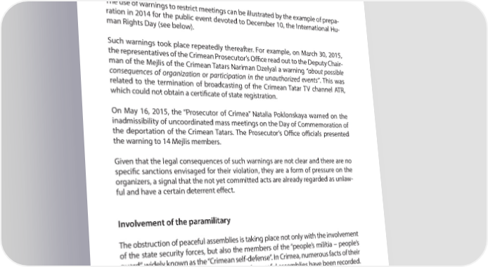 A YEAR AFTER: MAIN VIOLATIONS OF HUMAN RIGHTS IN CRIMEA PART 4 were arrested, on October 16 – Musa Apkerimov, on October 17 – Rustam Abdura- khmanov, on October 22 – Tahir Smedlyaev, on November 25 – Edem Ebulisov. Lat- er, all four of them were released on bail. Use of warnings for meeting restrictions The use of warnings to restrict meetings can be illustrated by the example of prepa- ration in 2014 for the public event devoted to December 10, the International Hu- man Rights Day (see below). Such warnings took place repeatedly thereafter. For example, on March 30, 2015, the representatives of the Crimean Prosecutor’s O7 ce read out to the Deputy Chair- man of the Mejlis of the Crimean Tatars Nariman Dzelyal a warning “about possible consequences of organization or participation in the unauthorized events”. This was related to the termination of broadcasting of the Crimean Tatar TV channel ATR, which could not obtain a certiR cate of state registration. On May 16, 2015, the “Prosecutor of Crimea” Natalia Poklonskaya warned on the inadmissibility of uncoordinated mass meetings on the Day of Commemoration of the deportation of the Crimean Tatars. The Prosecutor’s O7 ce o7 cials presented the warning to 14 Mejlis members. Given that the legal consequences of such warnings are not clear and there are no speciR c sanctions envisaged for their violation, they are a form of pressure on the organizers, a signal that the not yet committed acts are already regarded as unlaw- ful and have a certain deterrent eT ect. Involvement of the paramilitary The obstruction of peaceful assemblies is taking place not only with the involvement of the state security forces, but also the members of the “people’s militia – people’s guard”, widely known as the “Crimean self-defense”. In Crimea, numerous facts of their involvement in dispersing or obstruction of peaceful assemblies have been recorded. On August 24 (Ukraine’s Independence Day) 2014, in Simferopol, the monument to the Ukrainian writer Taras Shevchenko was cordoned oT by the law enforcement agencies and the “Crimean self-defense”. On December 10 of the same year, on the International Human Rights Day, the central streets of Simferopol were again cor- doned oT by the security forces and the “Crimean self-defense”. The journalists were prohibited to make photos and record videos. 113
