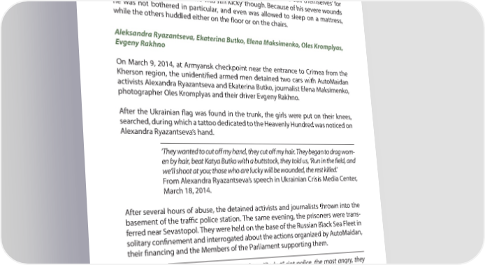 PART 4 A YEAR AFTER: MAIN VIOLATIONS OF HUMAN RIGHTS IN CRIMEA Yury was dragged into some room, thrown face down on the U oor, where he laid in a pool of his own blood, and then stripped to his underpants and tied to a chair with tape so that it was impossible to move. Then Shevchenko was brought to the rest of the hostages. Here they were all blind- folded, they were not even taken out to the toilet and had to ‘soil themselves’ for several days. Yury says that he ‘was still lucky’ though. Because of his severe wounds he was not bothered in particular, and even was allowed to sleep on a mattress, while the others huddled either on the U oor or on the chairs. Aleksandra Ryazantseva, Ekaterina Butko, Elena Maksimenko, Oles Kromplyas, Evgeny Rakhno On March 9, 2014, at Armyansk checkpoint near the entrance to Crimea from the Kherson region, the unidentiR ed armed men detained two cars with AutoMaidan activists Alexandra Ryazantseva and Ekaterina Butko, journalist Elena Maksimenko, photographer Oles Kromplyas and their driver Evgeny Rakhno. After the Ukrainian U ag was found in the trunk, the girls were put on their knees, searched, during which a tattoo dedicated to the Heavenly Hundred was noticed on Alexandra Ryazantseva’s hand. ‘They wanted to cut oR my hand, they cut oR my hair. They began to drag wom- en by hair, beat Katya Butko with a buttstock, they told us, ‘Run in the + eld, and we’ll shoot at you; those who are lucky will be wounded, the rest killed.’ From Alexandra Ryazantseva’s speech in Ukrainian Crisis Media Center, March 18, 2014. After several hours of abuse, the detained activists and journalists thrown into the basement of the tra7 c police station. The same evening, the prisoners were trans- ferred near Sevastopol. They were held on the base of the Russian Black Sea Fleet in solitary conR nement and interrogated about the actions organized by AutoMaidan, their R nancing and the Members of the Parliament supporting them. ‘The group comprised men from “Berkut” riot police, the most angry, they attacked us and yelled at us. One of their alleged chiefs, obeyed by others, came up to me. He held a big knife, saying, ‘I collect ears. Which do you pre- fer to have cut oR , left or right?’ Then he cut oR both of my running shoes tongues. After that, he ordered to the others to put all our documents in the package and burn them. And he threatened to rape us + rst and then shoot.’ From the interview with Ekaterina Butko, Ukrainian Pravda. Life, March 20, 2014. 62