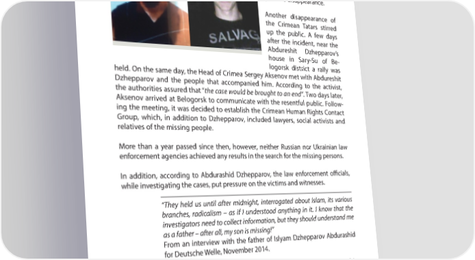 PART 4 A YEAR AFTER: MAIN VIOLATIONS OF HUMAN RIGHTS IN CRIMEA A criminal case under the ar- ticle ‘kidnapping committed by a group of persons with prior intention,’ was institut- ed after Dzhepparov and Is- lyamov’s disappearance. Another disappearance of the Crimean Tatars stirred up the public. A few days after the incident, near the Abdureshit Dzhepparov’s house in Sary-Su of Be- logorsk district a rally was held. On the same day, the Head of Crimea Sergey Aksenov met with Abdureshit Dzhepparov and the people that accompanied him. According to the activist, the authorities assured that “the case would be brought to an end”. Two days later, Aksenov arrived at Belogorsk to communicate with the resentful public. Follow- ing the meeting, it was decided to establish the Crimean Human Rights Contact Group, which, in addition to Dzhepparov, included lawyers, social activists and relatives of the missing people. More than a year passed since then, however, neither Russian nor Ukrainian law enforcement agencies achieved any results in the search for the missing persons. In addition, according to Abdurashid Dzhepparov, the law enforcement o7 cials, while investigating the cases, put pressure on the victims and witnesses. “They held us until after midnight, interrogated about Islam, its various branches, radicalism – as if I understood anything in it. I know that the investigators need to collect information, but they should understand me as a father – after all, my son is missing!” From an interview with the father of Islyam Dzhepparov Abdurashid for Deutsche Welle, November 2014. According to Deutsche Welle, Dzhepparov’s eldest son Abdullah disappeared in Syria in 2012. Perhaps he took part in military operations for the opposition togeth- er with Dzhevdet Islyamov there. Later, Dzhevdet came back home, but Abdullah did not. The investigating authorities of the Crimea are checking the facts of Dzhevdet Islyamov’s participation in the military operations on the side of the opposition in 70