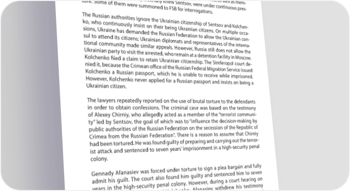PART 4 A YEAR AFTER: MAIN VIOLATIONS OF HUMAN RIGHTS IN CRIMEA Edem Asanov, sharing the R rst and last names with one of the suspects in Sentsov’s case by coincidence, disappeared and was later found dead in the Crimea under unknown circumstances. The o7 cial version of the Crimean authorities of Asanov’s death is suicide. The friends and relatives of Sentsov and Kolchenko in the Crimea, as well as mem- bers of the art center who personally knew Sentsov, were under continuous pres- sure. Some of them were summoned to FSB for interrogations. The Russian authorities ignore the Ukrainian citizenship of Sentsov and Kolchen- ko, who continuously insist on their being Ukrainian citizens. On multiple occa- sions, Ukraine has demanded the Russian Federation to allow the Ukrainian con- sul to attend its citizens; Ukrainian diplomats and representatives of the interna- tional community made similar appeals. However, Russia still does not allow the Ukrainian party to visit the arrested, who remain at a detention facility in Moscow. Kolchenko R led a claim to retain Ukrainian citizenship. The Simferopol court de- nied it, because the Crimean o7 ce of the Russian Federal Migration Service issued Kolchenko a Russian passport, which he is unable to receive while imprisoned. However, Kolchenko never applied for a Russian passport and insists on being a Ukrainian citizen. The lawyers repeatedly reported on the use of brutal torture to the defendants in order to obtain confessions. The criminal case was based on the testimony of Alexey Chirniy, who allegedly acted as a member of the “terrorist communi- ty” led by Sentsov, the goal of which was to “influence the decision-making by public authorities of the Russian Federation on the secession of the Republic of Crimea from the Russian Federation”. There is a reason to assume that Chirniy had been tortured. He was found guilty of preparing and carrying out the terror- ist attack and sentenced to seven years’ imprisonment in a high-security penal colony. Gennady Afanasiev was forced under torture to sign a plea bargain and fully admit his guilt. The court also found him guilty and sentenced him to seven years in the high-security penal colony. However, during a court hearing on charges against Sentsov and Kolchenko, Afanasiev withdrew his testimony against Sentsov and Kolchenko. He said that he testified under coercion and torture. According to him, in fact, he had never met Sentsov and Kolchenko before. On August 25, the military judge Sergey Mikhailyuk in Rostov announced the verdict for Oleg Sentsov and Alexander Kolchenko, which were convicted on terrorist charges. Sentsov was sentenced to 20 years in prison, Kolchen- 134