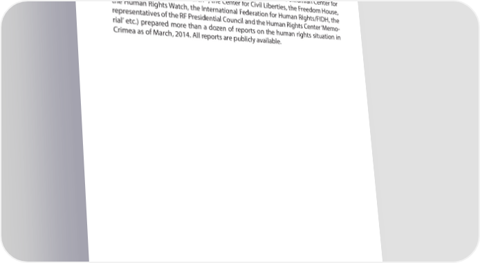 PART 2 INTERNATIONAL LEGAL ASPECT OF THE OCCUPATION OF ARC AND THE CITY OF SEVASTOPOL records and identiR ed trends suggest the need for the permanent monitoring of the human rights situation in Crimea by the independent international agencies. In addition to the above documents, a number of Ukrainian, Russian and inter- 57 national organizations (such as the Ukrainian Helsinki Human Rights Union , the 58 Crimean Field Mission, the Crimean Human Rights Group , the Ukrainian Center for 59 Independent Political Research , the Center for Civil Liberties, the Freedom House, the Human Rights Watch, the International Federation for Human Rights/FIDH, the representatives of the RF Presidential Council and the Human Rights Center ‘Memo- rial’ etc.) prepared more than a dozen of reports on the human rights situation in Crimea as of March, 2014. All reports are publicly available. 57 http://helsinki.org.ua/; http://helsinki.org.ua/publications/dopovid-pravozahysnyh-orhanizatsij-prava-lyudyny- v-ukrajini-2014/ 58 http://group.crimeahr.org/ 59 http://www.ucipr.kiev.ua/siteinfo/7 36