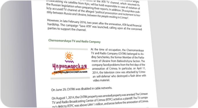PART 4 A YEAR AFTER: MAIN VIOLATIONS OF HUMAN RIGHTS IN CRIMEA Due to the systematic persecution in Crimea, the editors of the Crimean Tatar TV channel ATR decided to continue their activities in the mainland Ukraine and to resume broadcasting in Crimea through satellite TV. In response, on June 18, 2015, the Chairman of the Committee on Information Pol- icy, Communication and Mass Communications of the Crimea State Council Sergey Shuvaynikov said that the journalists of the ATR TV channel, which resumed its broadcasting via satellite from Kyiv, will be held responsible in case of violation of the Russian legislation when preparing their reports. In addition, Shuvaynikov pub- licly accused TV channel of the alleged “political provocation and incitement to hos- tility between Russia and Ukraine, between the people residing in Crimea”. However, in late February 2016, two years after the annexation, ATR faced R nancial hardship. The campaign “Save ATR” was launched, calling upon all the concerned parties to support the channel. Chernomorskaya TV and Radio Company At the time of occupation, the Chernomorskaya TV and Radio Company (ChTRK) belonged to An- drey Senchenko, the former Member of the Parlia- ment of Ukraine from Batkivshchyna faction. The company faced problems from the R rst days of the annexation of Crimea. In particular, on April 11, 2014, the television crew was attacked by ‘Crime- an self-defense’ who destroyed a U ash drive with video material. On June 29, ChTRK was disabled in cable networks. On August 1, 2014, the ChTRK property was arrested property was arrested. The Crimean TV and Radio Broadcasting Center of Crimea (RTPC) acted as a plaintiT . The TV compa- ny’s debt to RTPC was above UAH 1 million, and arose before the annexation of Crimea. Meanwhile, as reported by Lyudmila Zhuravleva, ChTRK Acting President, the RT- PC’s claim to Chernomorskaya company about the debt has not been reviewed by a court of R rst instance. However, all property and equipment of TV company was ar- rested, which, in fact, led to work termination. Zhuravleva also reported that ChTRK had a counterclaim to RTPC for the illegal use of private property, i.e., transmitters and frequencies. Since March 2014, RTPC held 13 transmitters privately owned by Chernomorskaya TV company. 104
