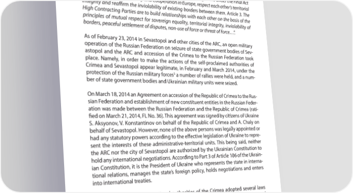 PART 2 INTERNATIONAL LEGAL ASPECT OF THE OCCUPATION OF ARC AND THE CITY OF SEVASTOPOL ence of Ukraine, and that none of their weapons will ever be used against Ukraine ex- cept in self-defense or otherwise in accordance with the Charter of the United Nations”. The Treaty of Friendship, Cooperation and Partnership between Ukraine and the Russian Federation of May 31, 1997 stipulates: “Article 2. The High Contracting Parties in accordance with the provisions of the UN Charter and obligations under the Final Act of the Conference on Security and Cooperation in Europe, respect each other’s territorial integrity and rea4 rm the inviolability of existing borders between them. Article 3. The High Contracting Parties are to build relationships with each other on the basis of the principles of mutual respect for sovereign equality, territorial integrity, inviolability of borders, peaceful settlement of disputes, non-use of force or threat of force…”. As of February 23, 2014 in Sevastopol and other cities of the ARC, an open military operation of the Russian Federation on seizure of state government bodies of Sev- astopol and the ARC and accession of the Crimea to the Russian Federation took place. Namely, in order to make the actions of the self-proclaimed authorities of Crimea and Sevastopol appear legitimate, in February and March 2014, under the 3 protection of the Russian military forces a number of rallies were held, and a num- ber of state government bodies and Ukrainian military units were seized. On March 18, 2014 an Agreement on accession of the Republic of Crimea to the Rus- sian Federation and establishment of new constituent entities in the Russian Feder- ation was made between the Russian Federation and the Republic of Crimea (rati- R ed on March 21, 2014, FL No. 36). This agreement was signed by citizens of Ukraine S. Aksyonov, V. Konstantinov on behalf of the Republic of Crimea and A. Chaly on behalf of Sevastopol. However, none of the above persons was legally appointed or had any statutory powers according to the eT ective legislation of Ukraine to repre- sent the interests of these administrative-territorial units. This being said, neither the ARC nor the city of Sevastopol are authorized by the Ukrainian Constitution to hold any international negotiations. According to Part 3 of Article 106 of the Ukrain- ian Constitution, it is the President of Ukraine who represents the state in interna- tional relations, manages the state’s foreign policy, holds negotiations and enters into international treaties. At a later stage, the occupational authorities of the Crimea adopted several laws and other regulations that led to severe deterioration of the situation in Crimea and Sevastopol and to violation of human rights and freedoms. These include: • the Decree of the VR of the ARC ‘On Approval of Regulation on the Vigilante 4 Group of the Crimea’ dated March 11, 2014 and the Law of the Republic of 3 http://www.bbc.com/russian/russia/2014/04/140417_putin_phone_line 4 http://crimea.gov.ru/act/11734 18
