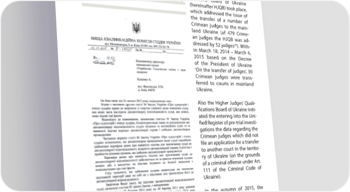PART 4 A YEAR AFTER: MAIN VIOLATIONS OF HUMAN RIGHTS IN CRIMEA Actions of the Ukrainian authorities with regard to the judges in the occupied territories of Crimea In August 2014, a meeting of the Higher Judges’ Qual- ifications Board of Ukraine (hereinafter HJQB) took place, which addressed the issue of the transfer of a number of Crimean judges to the main- land Ukraine (of 479 Crime- an judges the HJQB was ad- 35 dressed by 52 judges ). With- in March 18, 2014 – March 4, 2015 based on the Decree of the President of Ukraine ‘On the transfer of judges’, 30 Crimean judges were trans- ferred to courts in mainland Ukraine. Also the Higher Judges’ Quali- R cations Board of Ukraine initi- ated the entering into the Uni- R ed Register of pre-trial investi- gations the data regarding the Crimean judges which did not R le an application for a transfer to another court in the territo- ry of Ukraine (on the grounds of a criminal oT ense under Art. 111 of the Criminal Code of Ukraine). In the autumn of 2015, the Supreme Council of Justice of Ukraine suspended the consid- eration of a number of applications of Crimean judges on the voluntary resigna- tion from o7 ce, and decided to apply to the HJQB of Ukraine with applications for 36 checking the activities of these judges . 35 http://pravo.ua/news.php?id=43235 36 http://zib.com.ua/ua/119694-vischa_rada_yusticii_vnese_podannya_pro_zvilnennya_24_suddiv.html 128