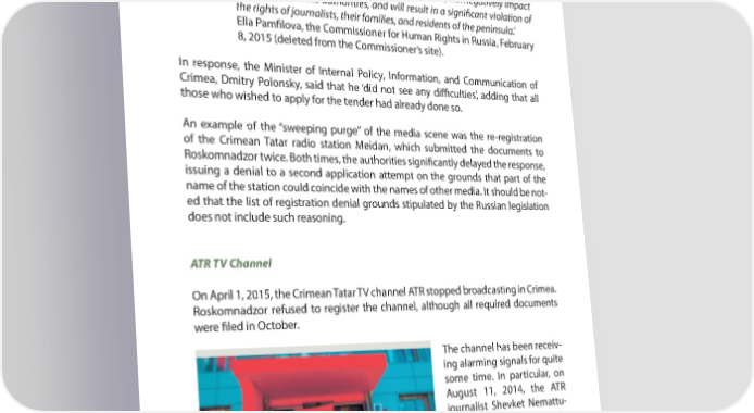 PART 4 A YEAR AFTER: MAIN VIOLATIONS OF HUMAN RIGHTS IN CRIMEA later). In her statement, PamR lova asked to take measures to preserve broadcasting companies operating in Crimea. ‘The termination of TV and radio broadcasting by the companies which have operated in Crimea for many years and were directly involved in the process of reuni+ cation of the Republic with Russia, will negatively impact a con+ dence in the authorities, and will result in a signi+ cant violation of the rights of journalists, their families, and residents of the peninsula.’ Ella PamR lova, the Commissioner for Human Rights in Russia, February 8, 2015 (deleted from the Commissioner’s site). In response, the Minister of Internal Policy, Information, and Communication of Crimea, Dmitry Polonsky, said that he ‘did not see any di7 culties’, adding that all those who wished to apply for the tender had already done so. An example of the “sweeping purge” of the media scene was the re-registration of the Crimean Tatar radio station Meidan, which submitted the documents to Roskomnadzor twice. Both times, the authorities signiR cantly delayed the response, issuing a denial to a second application attempt on the grounds that part of the name of the station could coincide with the names of other media. It should be not- ed that the list of registration denial grounds stipulated by the Russian legislation does not include such reasoning. ATR TV Channel On April 1, 2015, the Crimean Tatar TV channel ATR stopped broadcasting in Crimea. Roskomnadzor refused to register the channel, although all required documents were R led in October. The channel has been receiv- ing alarming signals for quite some time. In particular, on August 11, 2014, the ATR journalist Shevket Nemattu- laev lost his accreditation in the Crimean State Council as he did not stand up during the playback of the national anthems of the Russian Fed- eration and the Republic of Crimea. 102