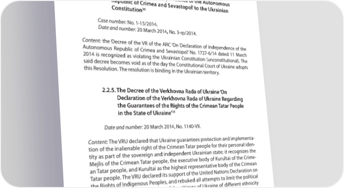 PART 2 INTERNATIONAL LEGAL ASPECT OF THE OCCUPATION OF ARC AND THE CITY OF SEVASTOPOL 2.2.4. The Resolution of the Constitutional Court of Ukraine on the case of constitutional submission of the Acting President of Ukraine, the Chairman of the Verkhovna Rada of Ukraine, regarding the compliance of the Decree of the Verkhovna Rada of the Autonomous Republic of Crimea ‘On Declaration of Independence of the Autonomous Republic of Crimea and Sevastopol’ to the Ukrainian Constitution30 Case number: No. 1-15/2014. Date and number: 20 March 2014, No. 3-rp/2014. Content: the Decree of the VR of the ARC ‘On Declaration of Independence of the Autonomous Republic of Crimea and Sevastopol’ No. 1727-6/14 dated 11 March 2014 is recognized as violating the Ukrainian Constitution (unconstitutional). The said decree becomes void as of the day the Constitutional Court of Ukraine adopts this Resolution. The resolution is binding in the Ukrainian territory. 2.2.5. The Decree of the Verkhovna Rada of Ukraine ‘On Declaration of the Verkhovna Rada of Ukraine Regarding the Guarantees of the Rights of the Crimean Tatar People in the State of Ukraine’31 Date and number: 20 March 2014, No. 1140-VII. Content: The VRU declared that Ukraine guarantees protection and implementa- tion of the inalienable right of the Crimean Tatar people for their personal iden- tity as part of the sovereign and independent Ukrainian state; it recognizes the Mejlis of the Crimean Tatar people, the executive body of Kurultai of the Crime- an Tatar people, and Kurultai as the highest representative body of the Crimean Tatar people. The VRU declared its support of the United Nations Declaration on the Rights of Indigenous Peoples, and rebuked all attempts to limit the political and social rights, the civil rights of the citizens of Ukraine of different ethnicity residing in the ARC, including but not limited to the Ukrainians, the Russians, the Crimean Tatars, the Armenians, the Bulgarians, the Greeks, the Germans, the Karaites, the Judeo-Crimean Tatars, observed following the anti-constitutional referendum. 30 http://www.ccu.gov.ua/doccatalog/document?id=244261 31 http://zakon5.rada.gov.ua/laws/show/1140-vii 26