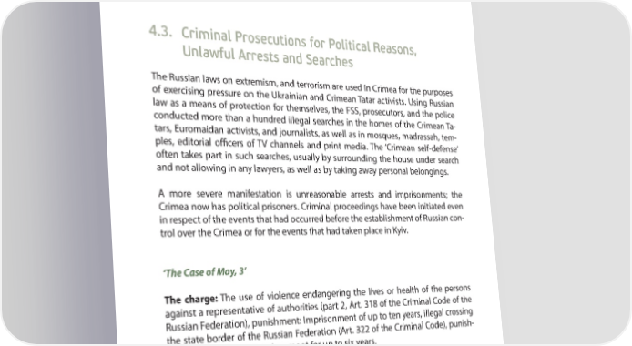 PART 4 A YEAR AFTER: MAIN VIOLATIONS OF HUMAN RIGHTS IN CRIMEA prison. Later, the Supreme Court of Crimea reduced the term of imprisonment to 3 years and 11 months. The relatives of the missing person and Kostenko’s lawyer believe that the disap- pearance of the detainee’s father may be related to the pressure upon his son who had previously reported regular beatings, threats, and abuse. 4.3. Criminal Prosecutions for Political Reasons, Unlawful Arrests and Searches The Russian laws on extremism, and terrorism are used in Crimea for the purposes of exercising pressure on the Ukrainian and Crimean Tatar activists. Using Russian law as a means of protection for themselves, the FSS, prosecutors, and the police conducted more than a hundred illegal searches in the homes of the Crimean Ta- tars, Euromaidan activists, and journalists, as well as in mosques, madrassah, tem- ples, editorial o7 cers of TV channels and print media. The ‘Crimean self-defense’ often takes part in such searches, usually by surrounding the house under search and not allowing in any lawyers, as well as by taking away personal belongings. A more severe manifestation is unreasonable arrests and imprisonments; the Crimea now has political prisoners. Criminal proceedings have been initiated even in respect of the events that had occurred before the establishment of Russian con- trol over the Crimea or for the events that had taken place in Kyiv. ‘The Case of May, 3’ The charge: The use of violence endangering the lives or health of the persons against a representative of authorities (part 2, Art. 318 of the Criminal Code of the Russian Federation), punishment: Imprisonment of up to ten years, illegal crossing the state border of the Russian Federation (Art. 322 of the Criminal Code), punish- ment: From a R ne to imprisonment for up to six years. The arrested persons: On October 16, 2014, Musa Apkerimov was arrested, followed by Rustam Abdurakhmanov on October 17, 2014, Tahir Smedlyaev on October 22, 2014, Edem Ebulisov on November 25, 2014, Edem Osmanov on January 20, 2015. Mustafa Dzhemilev, a well-known ativist and the leader of the Crimean Tatar Peo- ple was banned entry to Crimea on Marh 3, 2014. In response, the Crimean Tatars 74