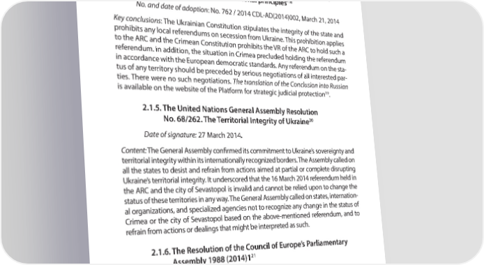 PART 2 INTERNATIONAL LEGAL ASPECT OF THE OCCUPATION OF ARC AND THE CITY OF SEVASTOPOL 2.1.4. The conclusion of the Venice Commission on ‘Whether the decision adopted by the Verkhovna Rada of the Autonomous Republic of Crimea in Ukraine on the organization of a referendum on whether to become a constituent entity of the Russian Federation or to restore the 1992 Constitution, 18 complies with the constitutional principles’ No. and date of adoption: No. 762 / 2014 CDL-AD(2014)002, March 21, 2014 Key conclusions: The Ukrainian Constitution stipulates the integrity of the state and prohibits any local referendums on secession from Ukraine. This prohibition applies to the ARC and the Crimean Constitution prohibits the VR of the ARC to hold such a referendum. In addition, the situation in Crimea precluded holding the referendum in accordance with the European democratic standards. Any referendum on the sta- tus of any territory should be preceded by serious negotiations of all interested par- ties. There were no such negotiations. The translation of the Conclusion into Russian is available on the website of the Platform for strategic judicial protection19. 2.1.5. The United Nations General Assembly Resolution No. 68/262. The Territorial Integrity of Ukraine20 Date of signature: 27 March 2014. Content: The General Assembly conR rmed its commitment to Ukraine’s sovereignty and territorial integrity within its internationally recognized borders. The Assembly called on all the states to desist and refrain from actions aimed at partial or complete disrupting Ukraine’s territorial integrity. It underscored that the 16 March 2014 referendum held in the ARC and the city of Sevastopol is invalid and cannot be relied upon to change the status of these territories in any way. The General Assembly called on states, internation- al organizations, and specialized agencies not to recognize any change in the status of Crimea or the city of Sevastopol based on the above-mentioned referendum, and to refrain from actions or dealings that might be interpreted as such. 2.1.6. The Resolution of the Council of Europe’s Parliamentary 21 Assembly 1988 (2014)1 Date of signature: 27 March 2014. Content: The Parliamentary Assembly rea7 rms its strong support for the independ- ence, sovereignty, and territorial integrity of Ukraine. The Assembly considers that 18 http://www.venice.coe.int/webforms/documents/default.aspx?pd7 le=CDL-AD(2014)002-e 19 http://precedent.in.ua/ru/index.php?id=1405671700 20 http://www.un.org/ga/search/view_doc.asp?symbol=A/RES/68/262&referer=/english/&Lang=R 21 http://assembly.coe.int/nw/xml/XRef/X2H-Xref-ViewPDF.asp?FileID=20873&lang=en 22