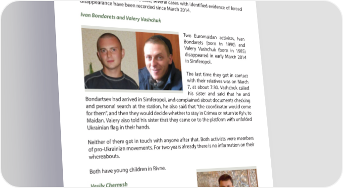 PART 4 A YEAR AFTER: MAIN VIOLATIONS OF HUMAN RIGHTS IN CRIMEA Cases with evidence of forced abduction One of the most high-proR le cases is the kidnapping and subsequent killing of Reshat Ametov, a Crimean Tatar, taken on 3 March at the central square of Sim- feropol by unidentiR ed men in camouU age uniforms (see the previous section). Apart from Reshat Ametov’s case, several cases with identiR ed evidence of forced disappearance have been recorded since March 2014. Ivan Bondarets and Valery Vashchuk Two Euromaidan activists, Ivan Bondarets (born in 1990) and Valery Vashchuk (born in 1985) disappeared in early March 2014 in Simferopol. The last time they got in contact with their relatives was on March 7, at about 7:30. Vashchuk called his sister and said that he and Bondartsev had arrived in Simferopol, and complained about documents checking and personal search at the station, he also said that “the coordinator would come for them”, and then they would decide whether to stay in Crimea or return to Kyiv, to Maidan. Valery also told his sister that they came on to the platform with unfolded Ukrainian U ag in their hands. Neither of them got in touch with anyone after that. Both activists were members of pro-Ukrainian movements. For two years already there is no information on their whereabouts. Both have young children in Rivne. Vasily Chernysh Vasily Chernysh (born in 1978), a resident of Sevastopol, also disappeared in March 2014. According to his relatives, he had earlier been a member of the Security Department of Ukraine, and participated in AutoMaidan movement. He was a Ternopil-native, and in Sevastopol he spoke Ukrainian. 66