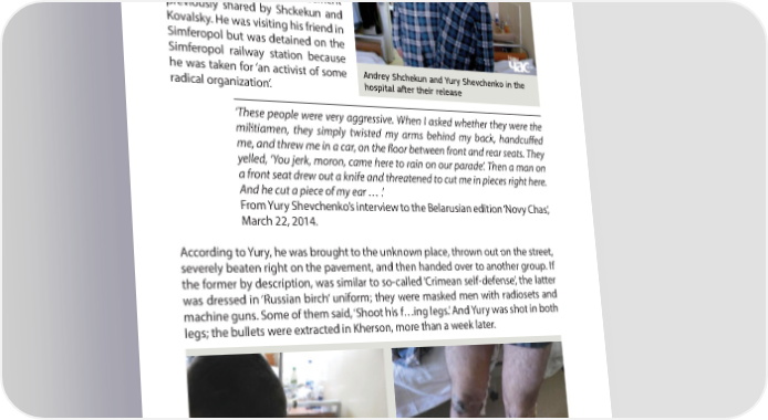 A YEAR AFTER: MAIN VIOLATIONS OF HUMAN RIGHTS IN CRIMEA PART 4 Yury Shevchenko Yuri Shevchenko, a young man from Pavlohrad in Dnipropetrovsk region who was not an activist and was not interested in politics, happened to be put in the same basement previously shared by Shckekun and Kovalsky. He was visiting his friend in Simferopol but was detained on the Simferopol railway station because he was taken for ‘an activist of some Andrey Shchekun and Yury Shevchenko in the radical organization’. hospital aſt er their release ‘These people were very aggressive. When I asked whether they were the militiamen, they simply twisted my arms behind my back, handcuR ed me, and threw me in a car, on the < oor between front and rear seats. They yelled, ‘You jerk, moron, came here to rain on our parade’. Then a man on a front seat drew out a knife and threatened to cut me in pieces right here. And he cut a piece of my ear … .’ From Yury Shevchenko’s interview to the Belarusian edition ‘Novy Chas’, March 22, 2014. According to Yury, he was brought to the unknown place, thrown out on the street, severely beaten right on the pavement, and then handed over to another group. If the former by description, was similar to so-called ‘Crimean self-defense’, the latter was dressed in ‘Russian birch’ uniform; they were masked men with radiosets and machine guns. Some of them said, ‘Shoot his f…ing legs.’ And Yury was shot in both legs; the bullets were extracted in Kherson, more than a week later. In the Crimean capture, Yury Shevchenko had a piece of ear cut and his legs shot through. Photo by: novychas.info 61