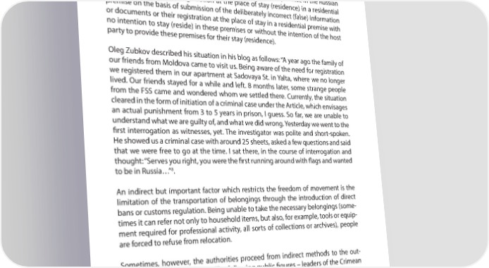 A YEAR AFTER: MAIN VIOLATIONS OF HUMAN RIGHTS IN CRIMEA PART 4 istration of a foreign citizen or stateless person at a place of residence in a residen- tial premise in the Russian Federation and envisages a penalty, which varies from a R ne in the amount of 100 thousand Russian rubles to imprisonment for a term not exceeding three years. Similar liability is envisaged for the R ctitious registration of foreign nationals or stateless persons. The R ctitious registration of foreign nationals or stateless persons at the place of residence in a residential premise in the Russian Federation means their registration at the place of stay (residence) in a residential premise on the basis of submission of the deliberately incorrect (false) information or documents or their registration at the place of stay in a residential premise with no intention to stay (reside) in these premises or without the intention of the host party to provide these premises for their stay (residence). Oleg Zubkov described his situation in his blog as follows: “A year ago the family of our friends from Moldova came to visit us. Being aware of the need for registration we registered them in our apartment at Sadovaya St. in Yalta, where we no longer lived. Our friends stayed for a while and left. 8 months later, some strange people from the FSS came and wondered whom we settled there. Currently, the situation cleared in the form of initiation of a criminal case under the Article, which envisages an actual punishment from 3 to 5 years in prison, I guess. So far, we are unable to understand what we are guilty of, and what we did wrong. Yesterday we went to the R rst interrogation as witnesses, yet. The investigator was polite and short-spoken. He showed us a criminal case with around 25 sheets, asked a few questions and said that we were free to go at the time. I sat there, in the course of interrogation and thought: “Serves you right, you were the R rst running around with U ags and wanted 8 to be in Russia…” . An indirect but important factor which restricts the freedom of movement is the limitation of the transportation of belongings through the introduction of direct bans or customs regulation. Being unable to take the necessary belongings (some- times it can refer not only to household items, but also, for example, tools or equip- ment required for professional activity, all sorts of collections or archives), people are forced to refuse from relocation. Sometimes, however, the authorities proceed from indirect methods to the out- right expulsion of dissidents. The following public R gures – leaders of the Crimean Tatar movement and activists have been deported: • On April 22, 2014 – Mustafa Dzhemilev, MP of Ukraine, a ban on the basis of par. 1 of Art. 27 of the Federal Law On the Procedure for Exit from the Russian Federation and Entry to the Russian Federation for a period of 5 (R ve) years to April 19, 2019; 8 http://olegzubkov.blogspot.com/2015/09/blog-post_58.html 87