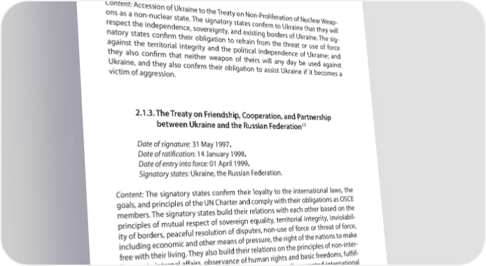 INTERNATIONAL LEGAL ASPECT OF THE OCCUPATION OF ARC AND THE CITY OF SEVASTOPOL PART 2 2.1.2. The Memorandum on Security Assurances in connection with Ukraine’s Accession to the Treaty 16 on the Non-Proliferation of Nuclear Weapons Date of signature: 5 December 1994. Date of entry into force: 5 December 1994. Content: Accession of Ukraine to the Treaty on Non-Proliferation of Nuclear Weap- ons as a non-nuclear state. The signatory states conR rm to Ukraine that they will respect the independence, sovereignty, and existing borders of Ukraine. The sig- natory states conR rm their obligation to refrain from the threat or use of force against the territorial integrity and the political independence of Ukraine; and they also conR rm that neither weapon of theirs will any day be used against Ukraine, and they also conR rm their obligation to assist Ukraine if it becomes a victim of aggression. 2.1.3. The Treaty on Friendship, Cooperation, and Partnership 17 between Ukraine and the Russian Federation Date of signature: 31 May 1997. Date of rati+ cation: 14 January 1998. Date of entry into force: 01 April 1999. Signatory states: Ukraine, the Russian Federation. Content: The signatory states conR rm their loyalty to the international laws, the goals, and principles of the UN Charter and comply with their obligations as OSCE members. The signatory states build their relations with each other based on the principles of mutual respect of sovereign equality, territorial integrity, inviolabil- ity of borders, peaceful resolution of disputes, non-use of force or threat of force, including economic and other means of pressure, the right of the nations to make free with their living. They also build their relations on the principles of non-inter- ference in internal aT airs, observance of human rights and basic freedoms, fulR ll- ment of their international liabilities, and other generally accepted international laws in good faith. 16 http://zakon4.rada.gov.ua/laws/show/998_158 17 http://zakon4.rada.gov.ua/laws/show/643_006 21