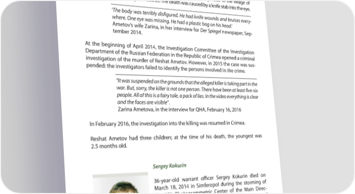 PART 4 A YEAR AFTER: MAIN VIOLATIONS OF HUMAN RIGHTS IN CRIMEA One of Ametov’s relatives said in the comment to the Human Rights Watch organi- zation that Reshat was well-known among the Crimean Tatars, he often addressed the authorities on local problems, and he regularly commented on political aT airs on his Facebook page. Ametov’s body with traces of violent death was found 10 days later in the village of Zemlyanichnoye in Belogorsk district. The death was caused by a knife stab into the eye. ‘The body was terribly dis+ gured. He had knife wounds and bruises every- where. One eye was missing. He had a plastic bag on his head.’ Ametov’s wife Zarina, in her interview for Der Spiegel newspaper, Sep- tember 2014. At the beginning of April 2014, the Investigation Committee of the Investigation Department of the Russian Federation in the Republic of Crimea opened a criminal investigation of the murder of Reshat Ametov. However, in 2015 the case was sus- pended: the investigators failed to identify the persons involved in the crime. “It was suspended on the grounds that the alleged killer is taking part in the war. But, sorry, the killer is not one person. There have been at least + ve-six people. All of this is a fairy tale, a pack of lies. In the video everything is clear and the faces are visible”. Zarina Ametova, in the interview for QHA, February 16, 2016 In February 2016, the investigation into the killing was resumed in Crimea. Reshat Ametov had three children; at the time of his death, the youngest was 2.5 months old. Sergey Kokurin 36-year-old warrant o7 cer Sergey Kokurin died on March 18, 2014 in Simferopol during the storming of th the 13 Photogrammetric Center of the Main Direc- torate of Operational Support of the Armed Forces of Ukraine. According to the forensic examination, the Ukrainian military was killed by two 5.45 calibre bullets a Kalash- nikov assault riU e, on an upward trajectory (Sergey was in the tower). 56