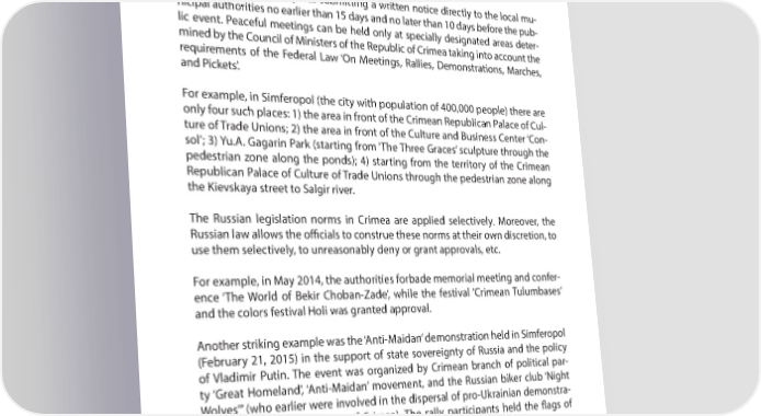 PART 4 A YEAR AFTER: MAIN VIOLATIONS OF HUMAN RIGHTS IN CRIMEA In addition, the local authorities introduce their own rules. On August 8, 2014, the State Council of the Republic of Crimea adopted the law ‘On Ensuring the Condi- tions for Exercise of the Right of Citizens of the Russian Federation to Hold Meet- ings, Rallies, Demonstrations, and Pickets in the Republic of Crimea’, considerably restricting the freedom of peaceful meetings. In particular, the law requires submitting a written notice directly to the local mu- nicipal authorities no earlier than 15 days and no later than 10 days before the pub- lic event. Peaceful meetings can be held only at specially designated areas deter- mined by the Council of Ministers of the Republic of Crimea taking into account the requirements of the Federal Law ‘On Meetings, Rallies, Demonstrations, Marches, and Pickets’. For example, in Simferopol (the city with population of 400,000 people) there are only four such places: 1) the area in front of the Crimean Republican Palace of Cul- ture of Trade Unions; 2) the area in front of the Culture and Business Center ‘Con- sol’; 3) Yu.A. Gagarin Park (starting from ‘The Three Graces’ sculpture through the pedestrian zone along the ponds); 4) starting from the territory of the Crimean Republican Palace of Culture of Trade Unions through the pedestrian zone along the Kievskaya street to Salgir river. The Russian legislation norms in Crimea are applied selectively. Moreover, the Russian law allows the o7 cials to construe these norms at their own discretion, to use them selectively, to unreasonably deny or grant approvals, etc. For example, in May 2014, the authorities forbade memorial meeting and confer- ence ‘The World of Bekir Choban-Zade’, while the festival ‘Crimean Tulumbases’ and the colors festival Holi was granted approval. Another striking example was the ‘Anti-Maidan’ demonstration held in Simferopol (February 21, 2015) in the support of state sovereignty of Russia and the policy of Vladimir Putin. The event was organized by Crimean branch of political par- ty ‘Great Homeland’, ‘Anti-Maidan’ movement, and the Russian biker club ‘Night Wolves’” (who earlier were involved in the dispersal of pro-Ukrainian demonstra- tions on the southern coast of Crimea). The rally participants held the U ags of Russia, Donetsk and Lugansk People’s Republics, as well as banners with slogans ‘No Maidan in Russia’, ‘Stop R fth column in the Central Bank’, ‘Our land, our rules’, and chanted ‘Russia’. The event was held in the center of Simferopol at the corner of Karl Marx and Pushkin streets. Moreover, the Crimean authorities allowed the organizers to drive cars and motorcycles on the territory of the pedestrian area. 110