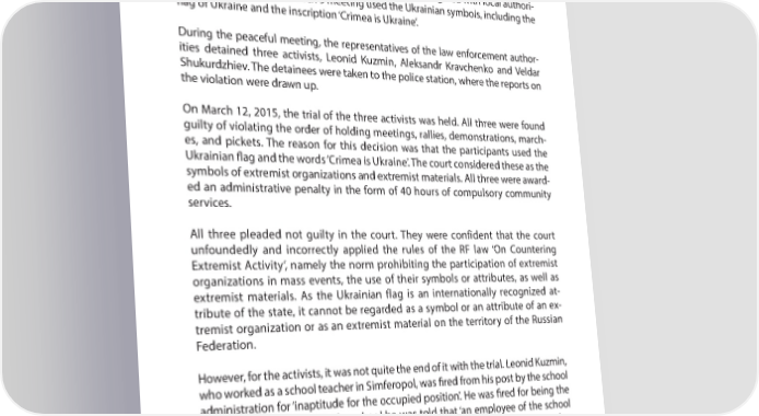 PART 4 A YEAR AFTER: MAIN VIOLATIONS OF HUMAN RIGHTS IN CRIMEA March 9 − The Anniversary of the Birth of the Ukrainian Writer Taras Shevchenko On March 9, 2015, a group of Ukrainian activists organized a meeting in Yuri Gagarin st Park of Simferopol on the occasion of the 201 anniversary of the birth of Taras Shevchenko, the famous Ukrainian writer. The event was agreed with local authori- ties. The participants of March 9 meeting used the Ukrainian symbols, including the U ag of Ukraine and the inscription ‘Crimea is Ukraine’. During the peaceful meeting, the representatives of the law enforcement author- ities detained three activists, Leonid Kuzmin, Aleksandr Kravchenko and Veldar Shukurdzhiev. The detainees were taken to the police station, where the reports on the violation were drawn up. On March 12, 2015, the trial of the three activists was held. All three were found guilty of violating the order of holding meetings, rallies, demonstrations, march- es, and pickets. The reason for this decision was that the participants used the Ukrainian U ag and the words ‘Crimea is Ukraine’. The court considered these as the symbols of extremist organizations and extremist materials. All three were award- ed an administrative penalty in the form of 40 hours of compulsory community services. All three pleaded not guilty in the court. They were confident that the court unfoundedly and incorrectly applied the rules of the RF law ‘On Countering Extremist Activity’, namely the norm prohibiting the participation of extremist organizations in mass events, the use of their symbols or attributes, as well as extremist materials. As the Ukrainian flag is an internationally recognized at- tribute of the state, it cannot be regarded as a symbol or an attribute of an ex- tremist organization or as an extremist material on the territory of the Russian Federation. However, for the activists, it was not quite the end of it with the trial. Leonid Kuzmin, who worked as a school teacher in Simferopol, was R red from his post by the school administration for ‘inaptitude for the occupied position’. He was R red for being the organizer of this event. At the school he was told that ‘an employee of the school has no right to participate in political activity’. Aleksandr Kravchenko was forced to leave the territory of Crimea. Later, on March 30, the court of Simferopol found Kurtsei Abdullaev, another partic- ipant of March 9 event, guilty and sentenced to 20 hours of compulsory community services. The reason again was the use of Ukrainian U ag and the inscription ‘Crimea is Ukraine’. 120