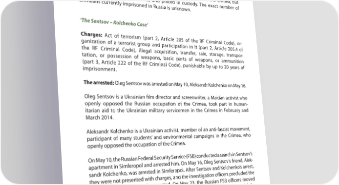 PART 4 A YEAR AFTER: MAIN VIOLATIONS OF HUMAN RIGHTS IN CRIMEA 4.13. Victims of the ‘Russian Justice’ in Moscow Crimean activists have not only become political prisoners in the Crimea, but have also been taken to Russia, and placed in custody. The exact number of Crimeans currently imprisoned in Russia is unknown. ‘The Sentsov – Kolchenko Case’ Charges: Act of terrorism (part 2, Article 205 of the RF Criminal Code), or- ganization of a terrorist group and participation in it (part 2, Article 205.4 of the RF Criminal Code), illegal acquisition, transfer, sale, storage, transpor- tation, or possession of weapons, basic parts of weapons, or ammunition (part 3, Article 222 of the RF Criminal Code), punishable by up to 20 years of imprisonment. The arrested: Oleg Sentsov was arrested on May 10, Aleksandr Kolchenko on May 16. Oleg Sentsov is a Ukrainian R lm director and screenwriter, a Maidan activist who openly opposed the Russian occupation of the Crimea, took part in human- itarian aid to the Ukrainian military servicemen in the Crimea in February and March 2014. Aleksandr Kolchenko is a Ukrainian activist, member of an anti-fascist movement, participant of many students’ and environmental campaigns in the Crimea, who openly opposed the occupation of the Crimea. On May 10, the Russian Federal Security Service (FSB) conducted a search in Sentsov’s apartment in Simferopol and arrested him. On May 16, Oleg Sentsov’s friend, Alek- sandr Kolchenko, was arrested in Simferopol. After Sentsov and Kolchenko’s arrest, they were not presented with charges, and the investigation o7 cers precluded the attorneys from meeting the arrested. On May 23, the Russian FSB o7 cers moved Aleksandr Kolchenko and Oleg Sentsov, both Ukrainian citizens, to a pre-trial de- tention facility in Moscow. On May 30, FSB announced that its o7 cers apprehended members of a sabotage and terrorism group of the Right Sector in the Crimea, who allegedly were pre- paring terrorist acts in Simferopol, Yalta, and Sevastopol. The Right Sector denied Sentsov’s a7 liation with it. 132
