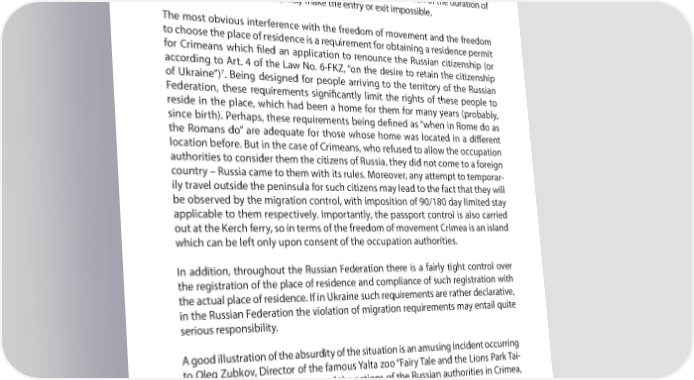 PART 4 A YEAR AFTER: MAIN VIOLATIONS OF HUMAN RIGHTS IN CRIMEA lation of the freedom of choice of the place of residence, on the contrary, can lead to a intent to or even the need to leave the peninsula. One example of the interference with the freedom of movement is the establishment of control over the entry/exit into the territory of peninsular. The existing conditions (for example, the availability of certain documents or the limitation of the duration of stay for non-Russian citizens) may make the entry or exit impossible. The most obvious interference with the freedom of movement and the freedom to choose the place of residence is a requirement for obtaining a residence permit for Crimeans which R led an application to renounce the Russian citizenship (or according to Art. 4 of the Law No. 6-FKZ, “on the desire to retain the citizenship 7 of Ukraine”) . Being designed for people arriving to the territory of the Russian Federation, these requirements signiR cantly limit the rights of these people to reside in the place, which had been a home for them for many years (probably, since birth). Perhaps, these requirements being deR ned as “when in Rome do as the Romans do” are adequate for those whose home was located in a diT erent location before. But in the case of Crimeans, who refused to allow the occupation authorities to consider them the citizens of Russia, they did not come to a foreign country – Russia came to them with its rules. Moreover, any attempt to temporar- ily travel outside the peninsula for such citizens may lead to the fact that they will be observed by the migration control, with imposition of 90/180 day limited stay applicable to them respectively. Importantly, the passport control is also carried out at the Kerch ferry, so in terms of the freedom of movement Crimea is an island which can be left only upon consent of the occupation authorities. In addition, throughout the Russian Federation there is a fairly tight control over the registration of the place of residence and compliance of such registration with the actual place of residence. If in Ukraine such requirements are rather declarative, in the Russian Federation the violation of migration requirements may entail quite serious responsibility. A good illustration of the absurdity of the situation is an amusing incident occurring to Oleg Zubkov, Director of the famous Yalta zoo “Fairy Tale and the Lions Park Tai- gan” in Crimea. Having supported the actions of the Russian authorities in Crimea, pretty soon he fell victim of a repressive mechanism. Article 322.2 of the Criminal Code of the RF establishes criminal responsibility for the R ctitious registration of the citizen of the Russian Federation at the place of stay or residence in a residential premise in the Russian Federation and the R ctitious reg- 7 See Section 4.4. Involuntary nationality 86