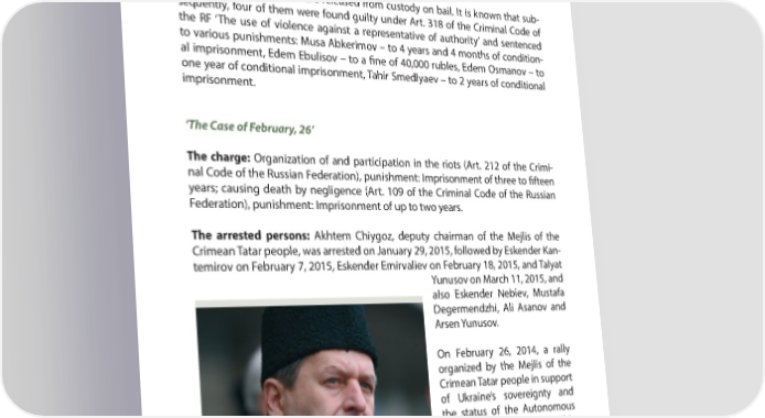 PART 4 A YEAR AFTER: MAIN VIOLATIONS OF HUMAN RIGHTS IN CRIMEA drugs, and forbidden extremist materials. In October, 4 Crimean Tatars were ar- rested: Musa Apkerimov, Rustam Abdurakhmanov, Tahir Smedlyaev, and Edem Ebulisov. On January 20, 2015, Eden Osmanov was arrested, the son of Mustafa Osmanov, the activist of Crimean Tatar national movement and the participant of Euromaidan in Kyiv. Later all the R ve people were released from custody on bail. It is known that sub- sequently, four of them were found guilty under Art. 318 of the Criminal Code of the RF ‘The use of violence against a representative of authority’ and sentenced to various punishments: Musa Abkerimov – to 4 years and 4 months of condition- al imprisonment, Edem Ebulisov – to a R ne of 40,000 rubles, Edem Osmanov – to one year of conditional imprisonment, Tahir Smedlyaev – to 2 years of conditional imprisonment. ‘The Case of February, 26’ The charge: Organization of and participation in the riots (Art. 212 of the Crimi- nal Code of the Russian Federation), punishment: Imprisonment of three to R fteen years; causing death by negligence (Art. 109 of the Criminal Code of the Russian Federation), punishment: Imprisonment of up to two years. The arrested persons: Akhtem Chiygoz, deputy chairman of the Mejlis of the Crimean Tatar people, was arrested on January 29, 2015, followed by Eskender Kan- temirov on February 7, 2015, Eskender Emirvaliev on February 18, 2015, and Talyat Yunusov on March 11, 2015, and also Eskender Nebiev, Mustafa Degermendzhi, Ali Asanov and Arsen Yunusov. On February 26, 2014, a rally organized by the Mejlis of the Crimean Tatar people in support of Ukraine’s sovereignty and the status of the Autonomous Republic of Crimea was held in Simferopol (the capital of the Crimea) near the Parliament of the Autonomous Republic of Crimea. The event was at- Pictured: Akhtem Chiygoz, the Deputy Head of the tended by several thousands of Crimean Tatar People Mejlis Crimeans. 76