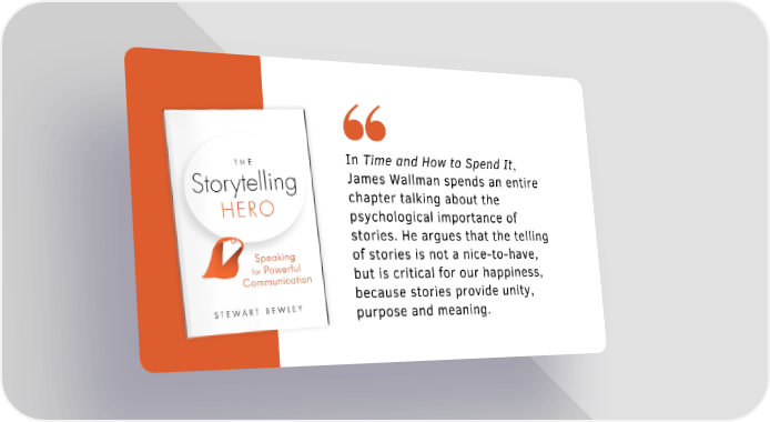 In Time and How to Spend It, James Wallman spends an entire chapter talking about the psychological importance of stories. He argues that the telling of stories is not a nice-to-have, but is critical for our happiness, because stories provide unity, purpose and meaning.