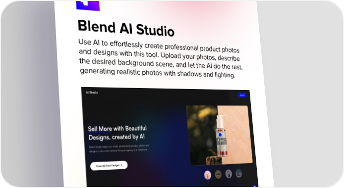 Blend AI Studio Use AI to effortlessly create professional product photos and designs with this tool. Upload your photos, describe the desired background scene, and let the AI do the rest, generating realistic photos with shadows and lighting.