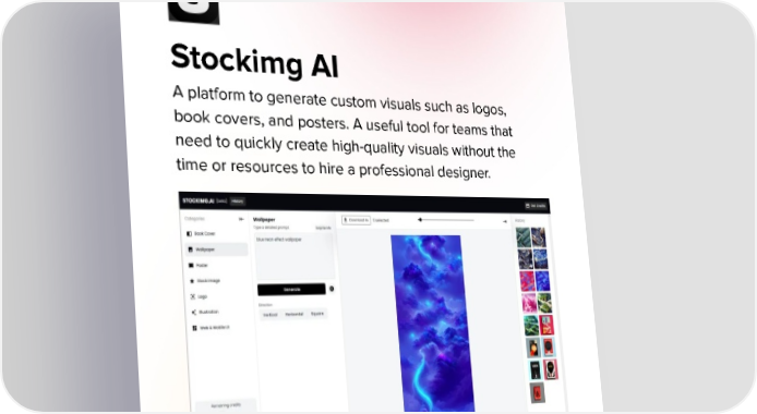 Stockimg AI A platform to generate custom visuals such as logos, book covers, and posters. A useful tool for teams that need to quickly create high-quality visuals without the time or resources to hire a professional designer.