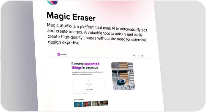 Magic Eraser Magic Studio is a platform that uses AI to automatically edit and create images. A valuable tool to quickly and easily create high-quality images without the need for extensive design expertise.