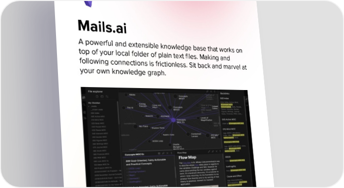 Mails.ai A powerful and extensible knowledge base that works on top of your local folder of plain text files. Making and following connections is frictionless. Sit back and marvel at your own knowledge graph.