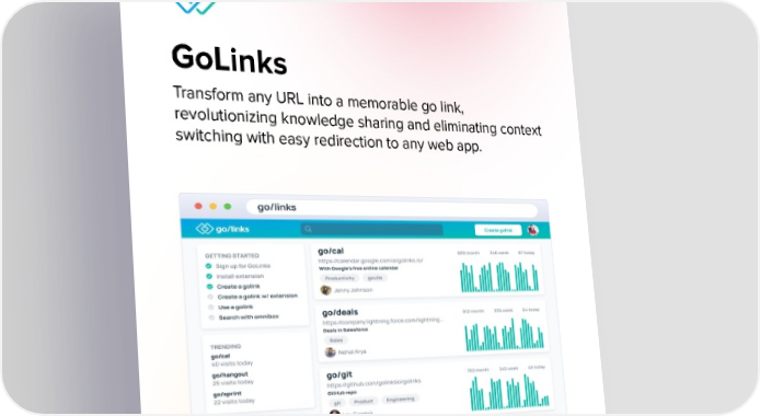 GoLinks Transform any URL into a memorable go link, revolutionizing knowledge sharing and eliminating context switching with easy redirection to any web app.