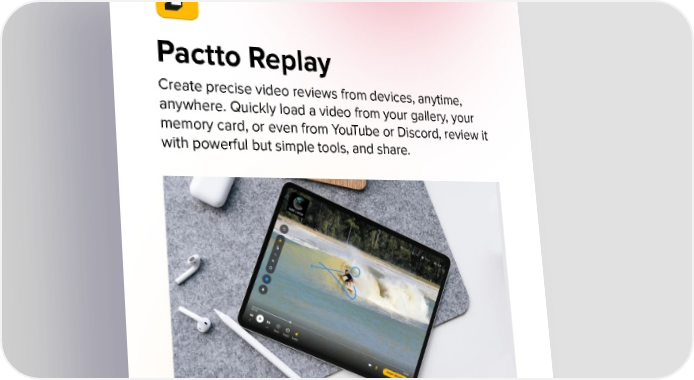 Pactto Replay Create precise video reviews from devices, anytime, anywhere. Quickly load a video from your gallery, your memory card, or even from YouTube or Discord, review it with powerful but simple tools, and share.