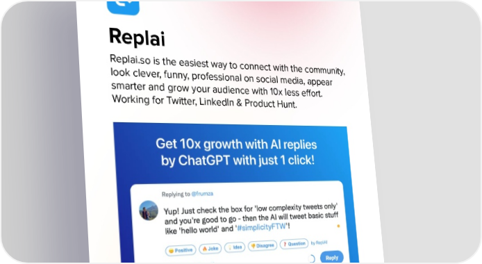 Replai Replai.so is the easiest way to connect with the community, look clever, funny, professional on social media, appear smarter and grow your audience with 10x less effort. Working for Twitter, LinkedIn & Product Hunt.
