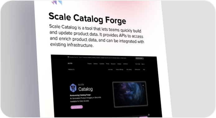 Scale Catalog Forge Scale Catalog is a tool that lets teams quickly build and update product data. It provides APIs to access and enrich product data, and can be integrated with existing infrastructure.