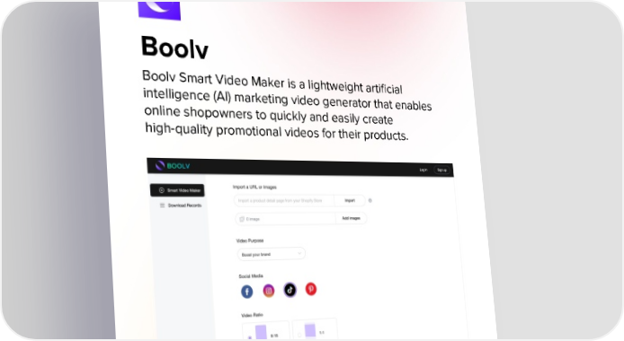 Boolv Boolv Smart Video Maker is a lightweight artiļ¬cial intelligence (Al) marketing video generator that enables online shopowners to quickly and easily create high-quality promotional videos for their products.