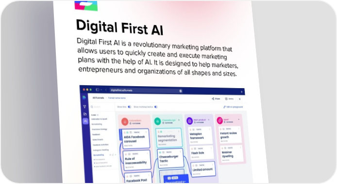 Digital First AI Digital First Al is a revolutionary marketing platform that allows users to quickly create and execute marketing plans with the help of Al. It is designed to help marketers, entrepreneurs and organizations of all shapes and sizes.