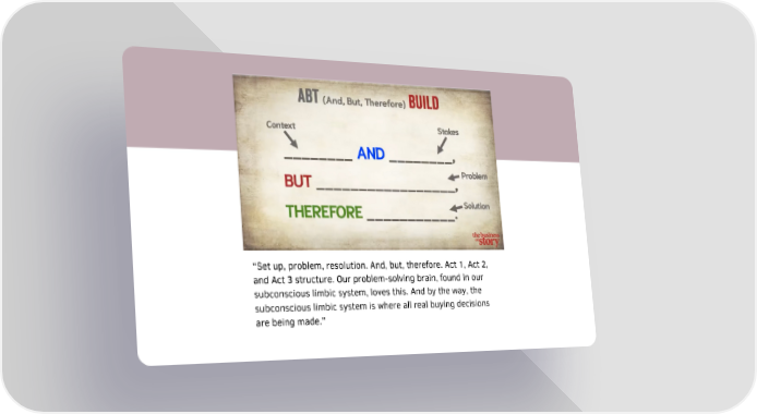 “Set up, problem, resolution. And, but, therefore. Act 1, Act 2, and Act 3 structure. Our problem-solving brain, found in our subconscious limbic system, loves this. And by the way, the subconscious limbic system is where all real buying decisions are being made.”