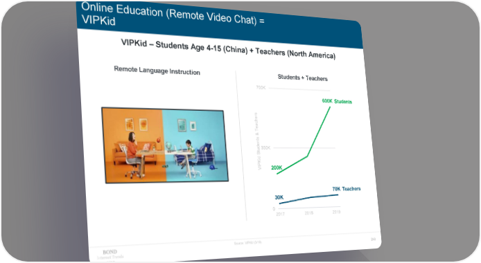 Online Education (Remote Video Chat) = VIPKid VIPKid – Students Age 4-15 (China) + Teachers (North America) Remote Language Instruction Students + Teachers 700K 600K Students s r he c ea T & ts en350K tud S d i K IP 200K V 70K Teachers 30K 0 2017 2018 2019 Source: VIPKid (3/19). Internet Trends 249 2019