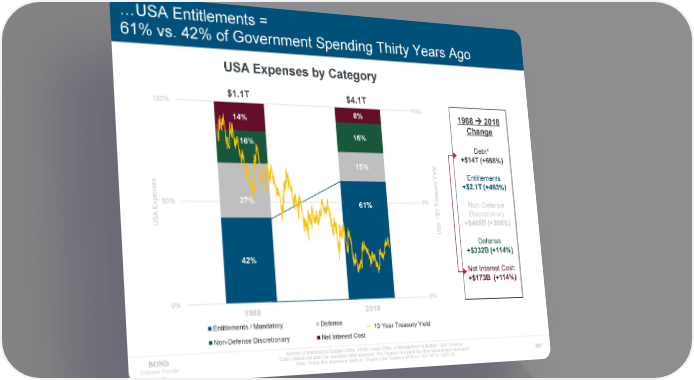 …USA Entitlements = 61% vs. 42% of Government Spending Thirty Years Ago USA Expenses by Category $1.1T $4.1T 100% 10% 14% 8% 1988 Æ2018 Change 16% 16% Debt* d +$14T (+668%) 15% el i Entitlements Y es y +$2.1T (+463%) ns ur eas pe 50% 27% 5% r x 61% T Non-Defense E Discretionary A 10Y US +$465B (+268%) SA U Defense 42% +$332B (+114%) Net Interest Cost: +$173B (+114%) 0% 0% 1988 2018 Entitlements / Mandatory Defense 10 Year Treasury Yield Non-Defense Discretionary Net Interest Cost Source: Congressional Budget Office, White House Office of Management & Budget, USA Treasury *Debt reflects net debt (i.e. excludes debt issued by The Treasury & owned by other Government accounts) Internet Trends Note: Yellow line represents yield on 10-year USA Treasury bill from 12/31/87 to 12/31/18. 267 2019