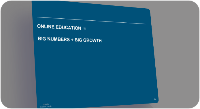 ONLINE EDUCATION = BIG NUMBERS + BIG GROWTH Internet Trends 233 2019 Internet Trends 2019 - Mary Meeker Page 79 Page 81Video Player is loading.Play VideoPlaySkip BackwardSkip ForwardMuteCurrent Time 0:00/Duration -:-Loaded: 0%0:00Stream Type LIVESeek to live, currently behind liveLIVERemaining Time --:- 1xPlayback RateChaptersChaptersDescriptionsdescriptions off, selectedCaptionscaptions settings, opens captions settings dialogcaptions off, selectedAudio TrackPicture-in-PictureFullscreenThis is a modal window.The media could not be loaded, either because the server or network failed or because the format is not supported.Beginning of dialog window. Escape will cancel and close the window.TextColorWhiteBlackRedGreenBlueYellowMagentaCyanOpacityOpaqueSemi-TransparentText BackgroundColorBlackWhiteRedGreenBlueYellowMagentaCyanOpacityOpaqueSemi-TransparentTransparentCaption Area BackgroundColorBlackWhiteRedGreenBlueYellowMagentaCyanOpacityTransparentSemi-TransparentOpaqueFont Size50%75%100%125%150%175%200%300%400%Text Edge StyleNoneRaisedDepressedUniformDrop shadowFont FamilyProportional Sans-SerifMonospace Sans-SerifProportional SerifMonospace SerifCasualScriptSmall CapsResetDoneClose Modal DialogEnd of dialog window.