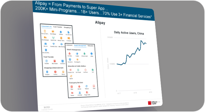 Alipay = From Payments to Super App… 200K+ Mini-Programs…1B+ Users…70% Use 3+ Financial Services* Alipay Daily Active Users, China 300MM na Chi , 150MM Us DA 0 2017-4/1704 20418/18-04 20419/19-04 Source: China DAU per QuestMobile (4/19),* Categories of financial services provided by Internet Trends Ant Financial include payment, wealth management, financing, insurance & credit system. 320 2019