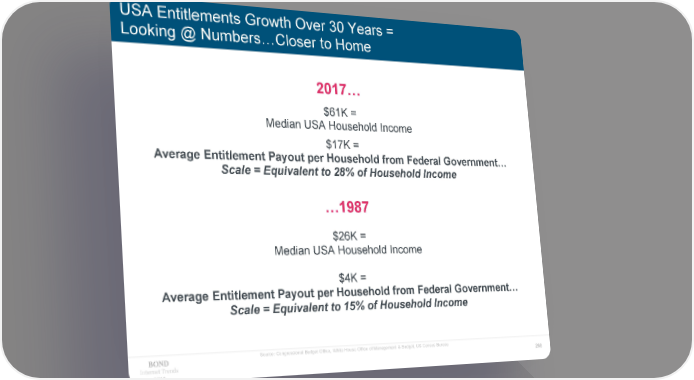 USA Entitlements Growth Over 30 Years = Looking @ Numbers…Closer to Home 2017… $61K = Median USA Household Income $17K = Average Entitlement Payout per Household from Federal Government… Scale = Equivalent to 28% of Household Income …1987 $26K = Median USA Household Income $4K = Average Entitlement Payout per Household from Federal Government… Scale = Equivalent to 15% of Household Income Source: Congressional Budget Office, White House Office of Management & Budget, US Census Bureau Internet Trends 268 2019