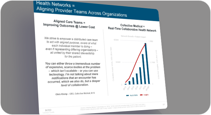 Health Networks = Aligning Provider Teams Across Organizations Aligned Care Teams = Collective Medical = Improving Outcomes @ Lower Cost Real-Time Collaborative Health Network Network Growth + Patient Impact We strive to empower a distributed care team 60MM 1.4MM to act with aligned purpose, aware of what each individual member is doing – ar) B ) even if representing differing organizations – ne ue Li all united by their shared stewardship l B ( Red for the patient. A ( , US A ts 30MM 0.7MM i , US You can either throw a tremendous number s i ts V gh of expensive, scarce bodies at the problem ute i –which isn’t scalable – or you can use c Ins A e e v technology. I’m not talking about mere v ti ti ec ec l notifications that an encounter has l Col occurred, which we also do, but a deeper Col level of collaboration. 0 0 Chris Klomp – CEO, Collective Medical, 6/19 Acute Visits Insights Source: Collective Medical Technologies Inc. (6/19). *2019E represents annualized data as of 6/19. Note: Acute Visits = Internet Trends Patient-Provider interactions (ED visit, IP stay). Insights = Unique provider-provider actions taken to optimize patient care 277 2019