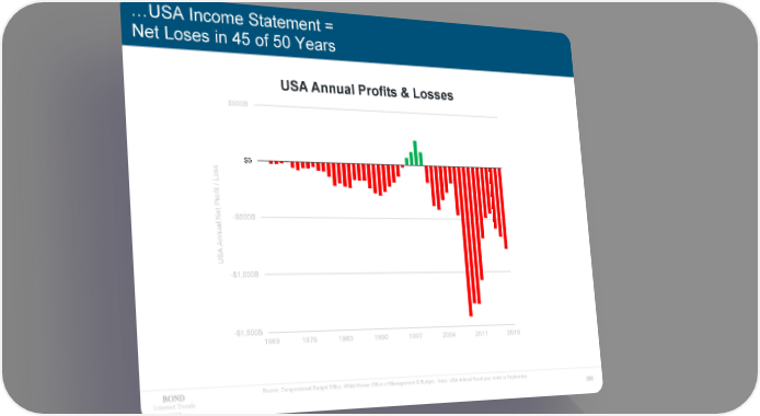 …USA Income Statement = Net Loses in 45 of 50 Years USA Annual Profits & Losses $500B $0 s $0 os / L t i of r P Net -$500B l ua nn A A US -$1,000B -$1,500B 1969 1976 1983 1990 1997 2004 2011 2018 Source: Congressional Budget Office, White House Office of Management & Budget. Note: USA federal fiscal year ends in September. Internet Trends 265 2019