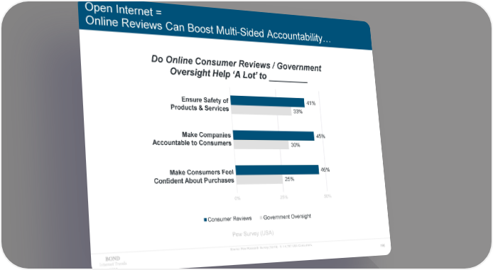 Open Internet = Online Reviews Can Boost Multi-Sided Accountability… Do Online Consumer Reviews / Government Oversight Help ‘A Lot’ to _________ Ensure Safety of 41% Ensure Safety of Products / Services Products & Services 33% Make Companies 45% Make Companies Accountable to Consumers Accountable to Consumers 30% Make Consumers Feel 46% Make Consumers Feel Confident About Purchases 25% Confident About Purchases 0% 25% 50% Consumer Reviews Government Oversight Pew Survey (USA) Source: Pew Research Survey (12/15). N = 4,787 USA Consumers. Internet Trends 195 2019
