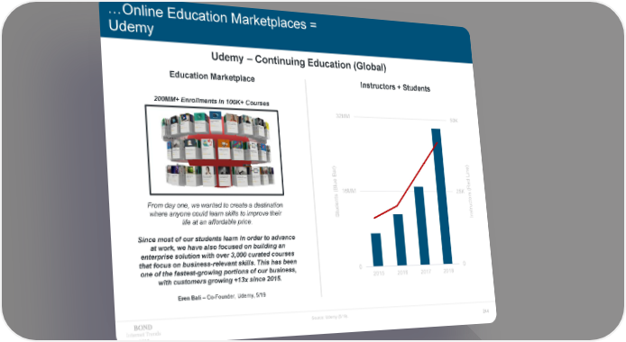 …Online Education Marketplaces = Udemy Udemy –Continuing Education (Global) Education Marketplace Instructors + Students 200MM+ Enrollments in 100K+ Courses 32MM 50K ) ar) ne B Li ue l Red B ( ( 16MM 25K ts tors From day one, we wanted to create a destination en uc where anyone could learn skills to improve their tud tr life at an affordable price. S Ins Since most of our students learn in order to advance at work, we have also focused on building an enterprise solution with over 3,000 curated courses that focus on business-relevant skills. This has been one of the fastest-growing portions of our business, 0 0 with customers growing +13x since 2015. 2015 2016 2017 2018 Eren Bali – Co-Founder, Udemy, 5/19 Source: Udemy (5/19). Internet Trends 244 2019