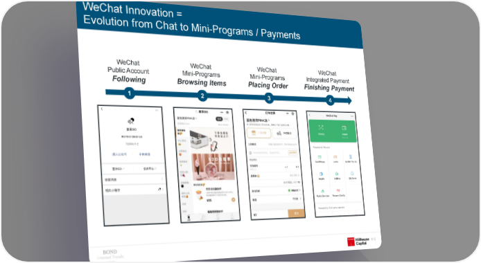 WeChat Innovation = Evolution from Chat to Mini-Programs / Payments WeChat WeChat WeChat WeChat Public Account Mini-Programs Mini-Programs Integrated Payment Following Browsing Items Placing Order Finishing Payment 1 2 3 4 Internet Trends 315 2019