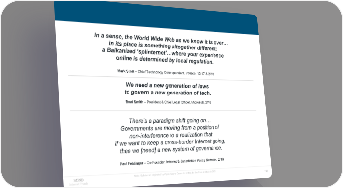 In a sense, the World Wide Web as we know it is over… in its place is something altogether different: a Balkanized ‘splinternet’…where your experience online is determined by local regulation. Mark Scott – Chief Technology Correspondent, Politico, 12/17 & 2/18 We need a new generation of laws to govern a new generation of tech. Brad Smith – President & Chief Legal Officer, Microsoft, 2/18 There’s a paradigm shift going on… Governments are moving from a position of non-interference to a realization that if we want to keep a cross-border Internet going, then we [need] a new system of governance. Paul Fehlinger – Co-Founder, Internet & Jurisdiction Policy Network, 2/18 Note: ‘Splinternet’ originated by Clyde Wayne Crews Jr. writing for the Cato Institute in 2001. Internet Trends 188 2019