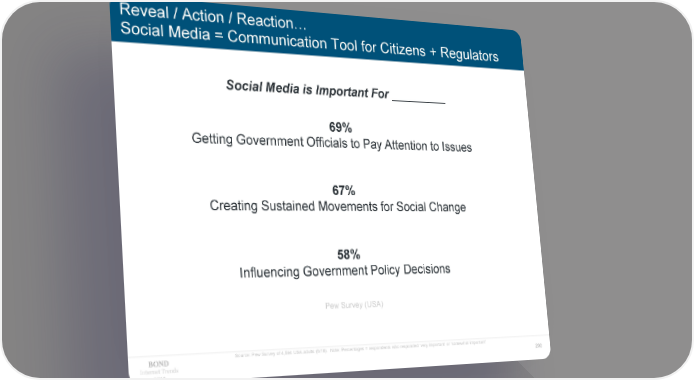 Reveal / Action / Reaction… Social Media = Communication Tool for Citizens + Regulators Social Media is Important For _________ 69% Getting Government Officials to Pay Attention to Issues 67% Creating Sustained Movements for Social Change 58% Influencing Government Policy Decisions Pew Survey (USA) Source: Pew Survey of 4,594 USA adults (6/18). Note: Percentages = respondents who responded ‘very important’ or ‘somewhat important’ Internet Trends 200 2019