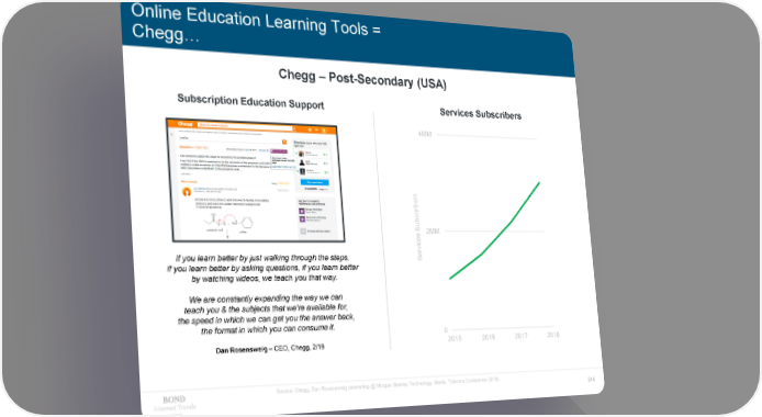 Online Education Learning Tools = Chegg… Chegg –Post-Secondary (USA) Subscription Education Support Services Subscribers 4MM s r be i r c s ub S 2MM es c i If you learn better by just walking through the steps, erv S if you learn better by asking questions, if you learn better by watching videos, we teach you that way. We are constantly expanding the way we can teach you & the subjects that we're available for, the speed in which we can get you the answer back, the format in which you can consume it. 0 Dan Rosensweig –CEO, Chegg, 2/19 2015 2016 2017 2018 Source: Chegg, Dan Rosensweig presenting @ Morgan Stanley Technology, Media, Telecom Conference (2/19). Internet Trends 246 2019